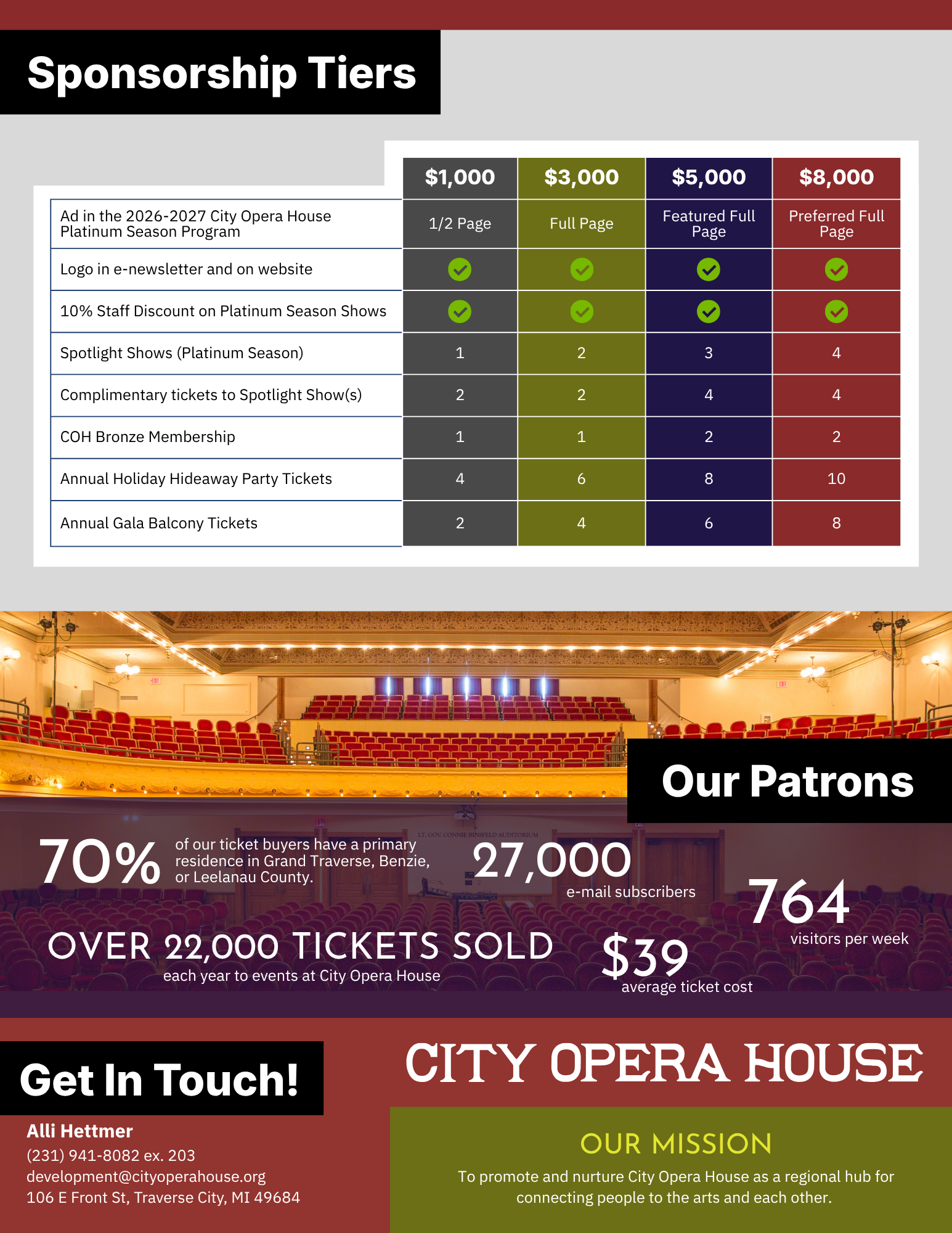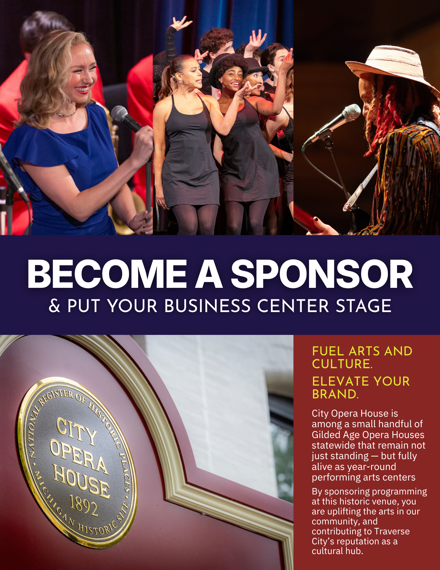 Sustain a Traverse City Treasure. City Opera House is a non-profit organization devoted to presenting national touring acts from around the world. Your sponsorship helps inspire the community’s passion for the arts and highlights your commitment to enhancing the quality of life in the northern Michigan community.